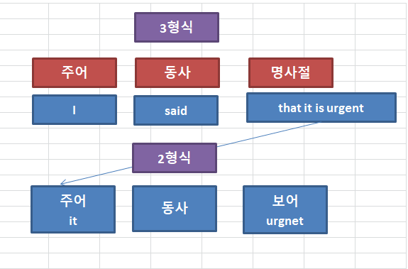 한 문장에서 문장의 5가지 형식인 5형식이 2가지 혹은 3가지 패턴이 사용되는 경우가 많습니다. 예를 들어서 I said that it was urgent라고 한다면 주절의 I 는 주어, said 동사, that 절 목적어 입니다. 목적어로 사용되는 that절에서 다시 it 주어, is 동사, urgent보어로 2형식 패턴을 가지고 있습니다.