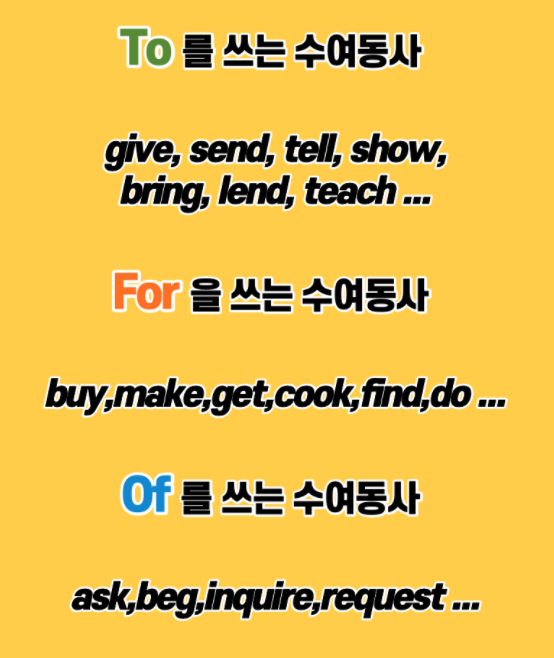 4형식 예문은 잘 보셨나요. 4 형식으로 쓰일 수 있는 동사는 엄청나게 많습니다. 무식하게 다 외우실 필요는 없겠죠. 4 형식 패턴에 대해새 잘 이해하신다면 자연스럽게 이해가 될 것입니다.