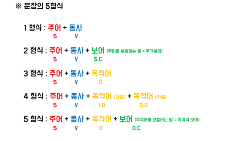 1탄에서 말씀드린 것 처럼, 영어 문장은 대부분 이렇게 5개의 형식으로 나눌 수 있습니다. 이렇게 기본 어순을 익히시면, 그 후 영문법은 여기 뼈대에 살을 붙이는 작업이라고 생각하시면 됩니다. 아래 예시를 통해 5형식을 다시 한번 보면서 혹시 조금이라도 헷갈리는 문장이 있는지 자가진단 해보시길 바랍니다.