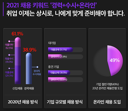 2021년 대기업 취업에서 가장 핫한 3가지 키워드는 경력채용, 수시채용, 그리고 온라인전형 강화로 꼽을 수 있습니다. 현재 코로나 사태로 대기업 실적이 감소하는 만큼, 대부분의 국내 30대 100대 기업들이 공개채용을 버리고 채용연계형 인턴이나 수시채용으로 방향을 틀었습니다.